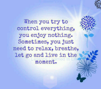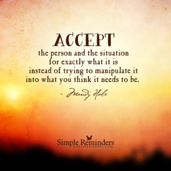As much as we would like to be in control of every situation we must be mature enough to know that that’s not possible. Acceptance happens when we realize and understand this and stop trying to manipulate the people and events in our lives. Inner peace happens when we learn to go with the flow and let things happen. Remember…. work with what you can and step back from what you can’t. All things have a way of working themselves out.